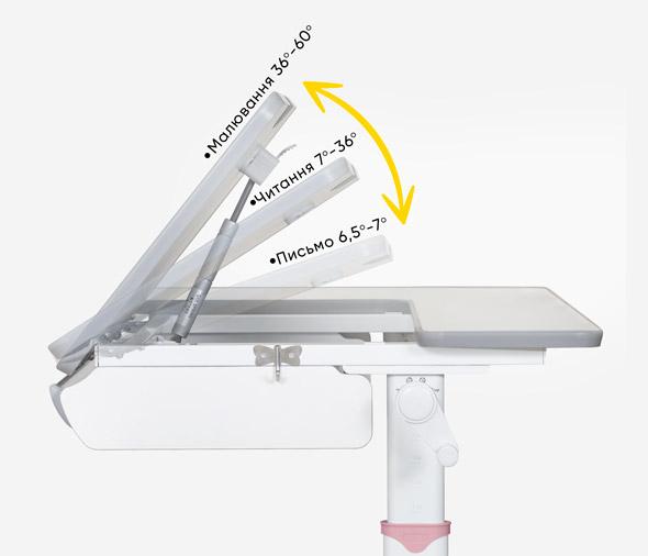С помощью газлифта подвижная часть столешницы изменяет угол наклона до 60 градусов. Столешницу с отрегулированным углом наклона можно использовать для письма, чтения и рисования.