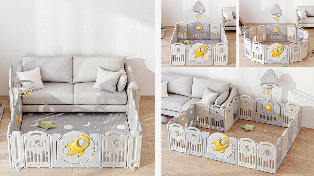 The modular design allows you to change the shape of the playpen. Square, round, or rectangular — choose the desired option and adjust the playpen to fit the room’s dimensions