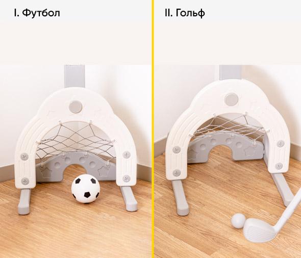 Конструкція має ворота для гри у футбол та гольф. Зміна активної діяльності позитивно впливає на розвиток уяви та фізичних навичок малюка .