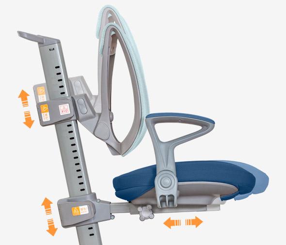 Крісло має можливість окремого регулювання висоти спинки і сидіння. Висоту можна налаштувати за допомогою фіксаторів-затискачів, розташованих на трубі. Глибина регулюється спеціальним гвинтом, що знаходиться під сидінням.