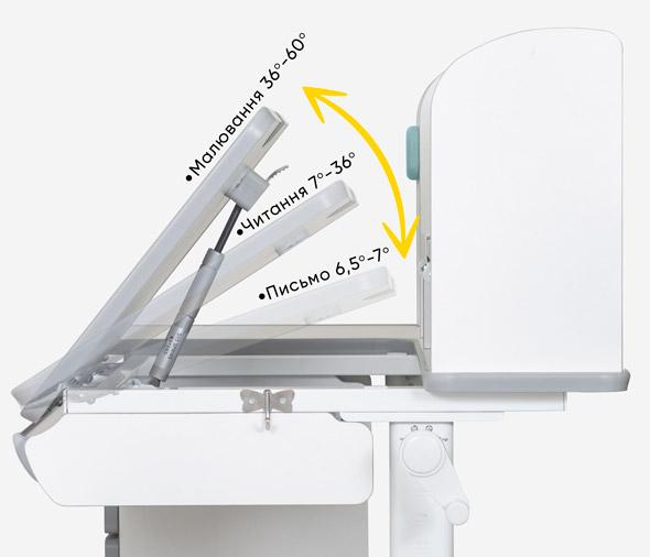 За допомогою газліфта рухлива частина стільниці змінює кут нахилу до 60 градусів. Стільницю з відрегульованим кутом нахилу можна використовувати для письма, читання та малювання.