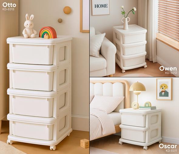 Стелажі Oscar, Otto та Owen поєднують універсальність та практичність. Їх можна використовувати як компактні приліжкові тумби, місткі бокси для іграшок або як додаткове місце для зберігання, налаштовуючи під будь-яку кімнату чи щоденний сценарій