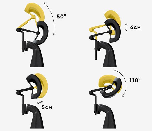Підголівник крісла регулюється у чотирьох точках: по висоті, глибині та змінює кут нахилу у двох площинах. Велика кількість налаштувань дозволяє контролювати відчуття напруги та є допоміжним фактором у знятті навантаження на шийний відділ хребта
