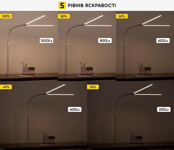 Лампа має 5 рівнів яскравості, що покроково змінюються. Завдяки налаштуванню мінімальної яскравості її можна використовувати в якості нічника. Максимальна яскравість підходить для виконання точної, делікатної роботи.