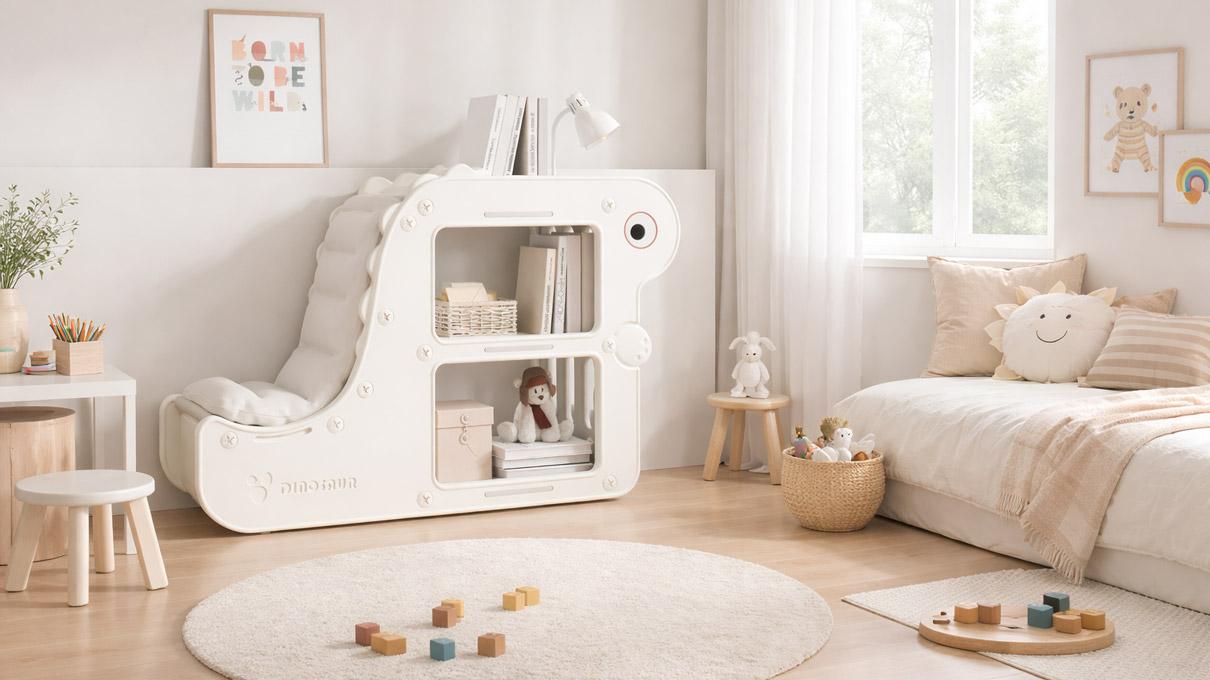 Декоративні елементи у формі динозаврика роблять стелаж цікавим для дітей. Дизайн створює позитивну атмосферу та доповнює інтер'єр дитячої кімнати