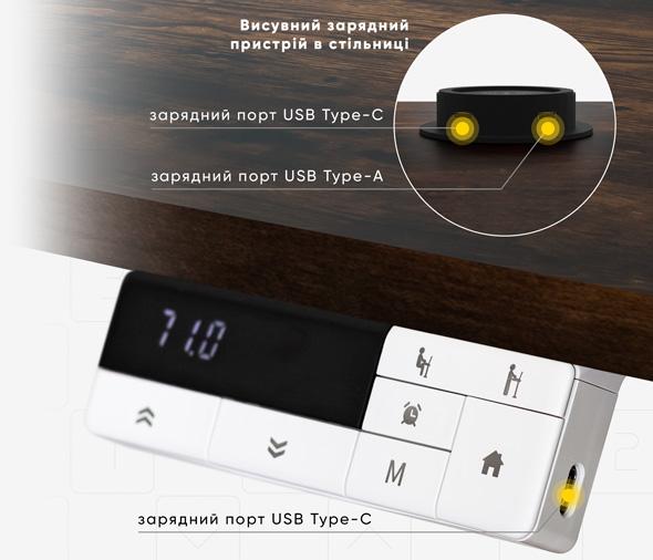 Порти 2 USB-C і 1 USB-A розташовані на стільниці та панелі керування, забезпечуючи швидке та зручне заряджання пристроїв