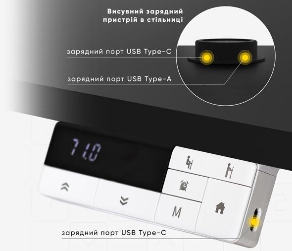 Цей стіл має панель керування, що дозволяє зберегти три налаштування висоти та заряджати гаджети. Вирішуйте самі, з якого боку стільниці її зручніше розмістити. На панелі є таймер для нагадування зміни положення чи для власних важливих задач.