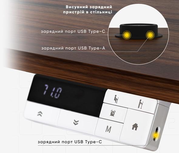 Панель керування столом оснащена функцією пам'яті на три позиції та роз'ємом для зручного заряджання. Її можна розташувати як з лівого, так і з правого боку. Таймер на панелі можна налаштувати як для нагадування про зміну пози, так і для контролю особистих справ чи перерв