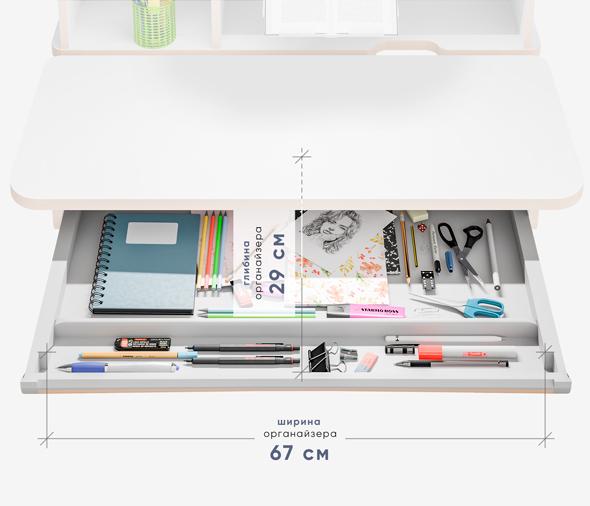 Под столешницей расположен органайзер для удобного хранения тетрадей, ручек и других мелочей, что помогает поддерживать порядок и освобождает рабочее пространство