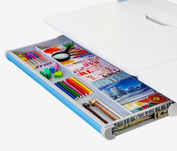 Стол имеет большой выдвижной органайзер, расположенный под столешницей, изготовленный из прочного, безопасного пластика. В таком органайзере школьные принадлежности будут разложены по назначению.