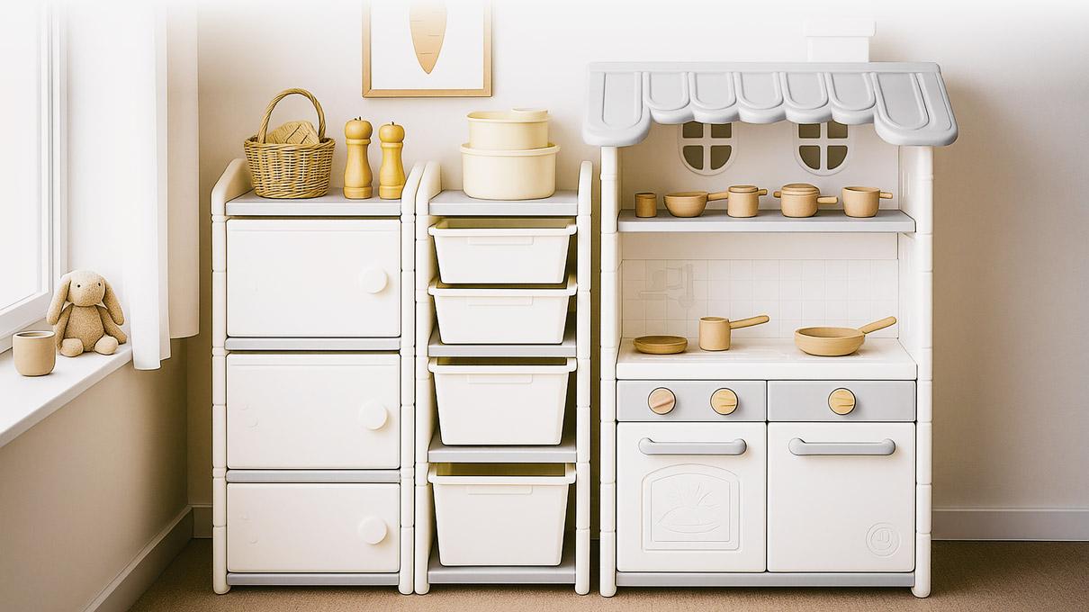 Кухня-стеллаж – это комплексный подход к хранению вещей и развитию творческого потенциала малыша. В контейнерах и шкафчиках можно хранить одежду и игрушки, а на двойной поверхности LEGO/Мольберт ребенок играет, рисует и развивает мелкую моторику
